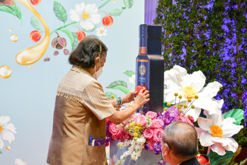 จากนั้น ทอดพระเนตรนิทรรศการบอกเล่าเรื่องราวน้ำมันเมล็ดคามีเลีย และการจัดแสดงผ้าไหมย้อมสีธรรมชาติจากเปลือกของผลชาน้ำมัน สายพันธุ์คามีเลีย โอลีเฟร่า โดยกลุ่มทอผ้าไหมจากศูนย์เรียนรู้หม่อนไหมของมูลนิธิชัยพัฒนา ณ บ้านโนนเสาเล้า อำเภอบ้านเขว้า จังหวัดชัยภูมิ รวมถึงงานศิลปะ Heart Installation จากศิลปินรับเชิญภายใต้คอนเซ็ปต์ “Born from Heart, Made for Health”