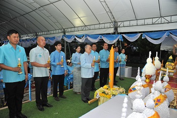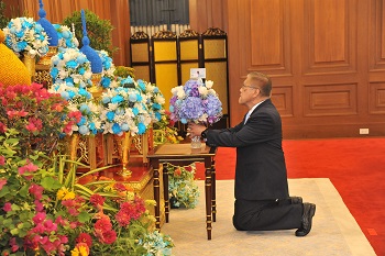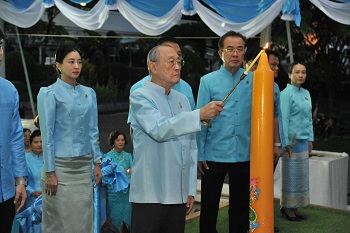 At 6:30 p.m., Mr. Sumet Tantivejkul, Member and Secretary-General of the Chaipattana Foundation, presided over the ceremony to pay royal respects and lay floral offerings, light candles in tribute, and lead the Royal Praise in honor of Her Majesty Queen Sirikit’s Birthday Anniversary at Rama IX Golden Jubilee, Bangkok.