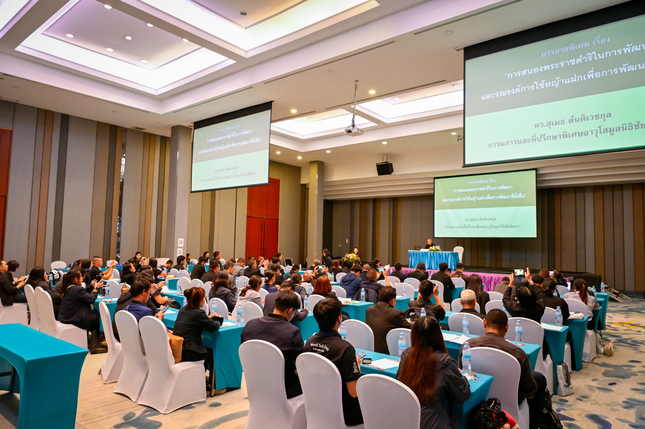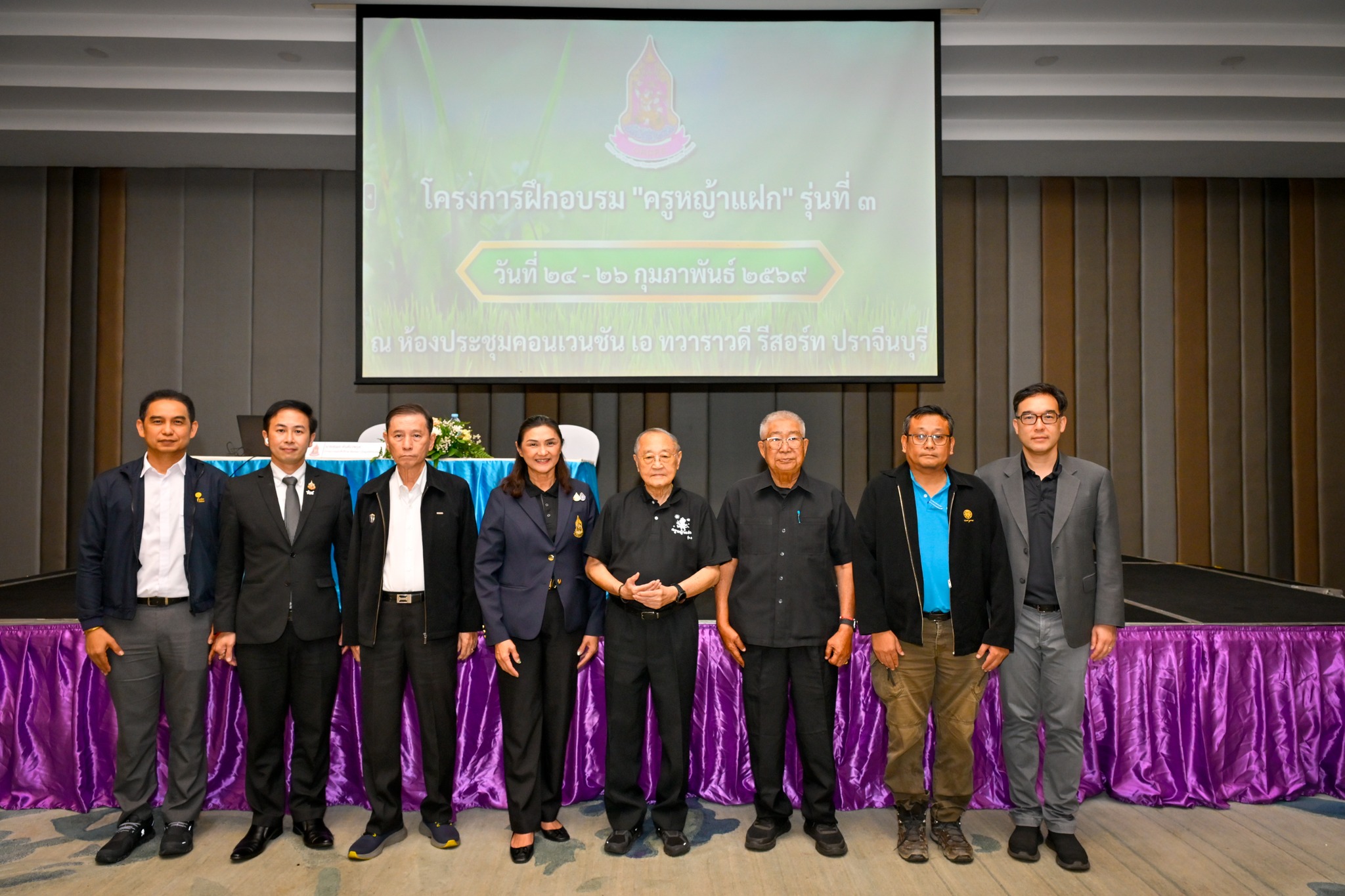 วันที่ 24 กุมภาพันธ์ 2569 นายสุเมธ ตันติเวชกุล กรรมการและที่ปรึกษาพิเศษอาวุโสมูลนิธิชัยพัฒนา เป็นวิทยากรบรรยายพิเศษหัวข้อ “การสนองพระราชดำริในการพัฒนาและรณรงค์การใช้หญ้าแฝกเพื่อการพัฒนาที่ยั่งยืน” ในโครงการฝึกอบรม “ครูหญ้าแฝก” รุ่นที่ 3 จัดโดยสำนักงานคณะกรรมการพิเศษเพื่อประสานงานโครงการอันเนื่องมาจากพระราชดำริ (สำนักงาน กปร.) ณ โรงแรมทวารวดี รีสอร์ท จังหวัดปราจีนบุรี