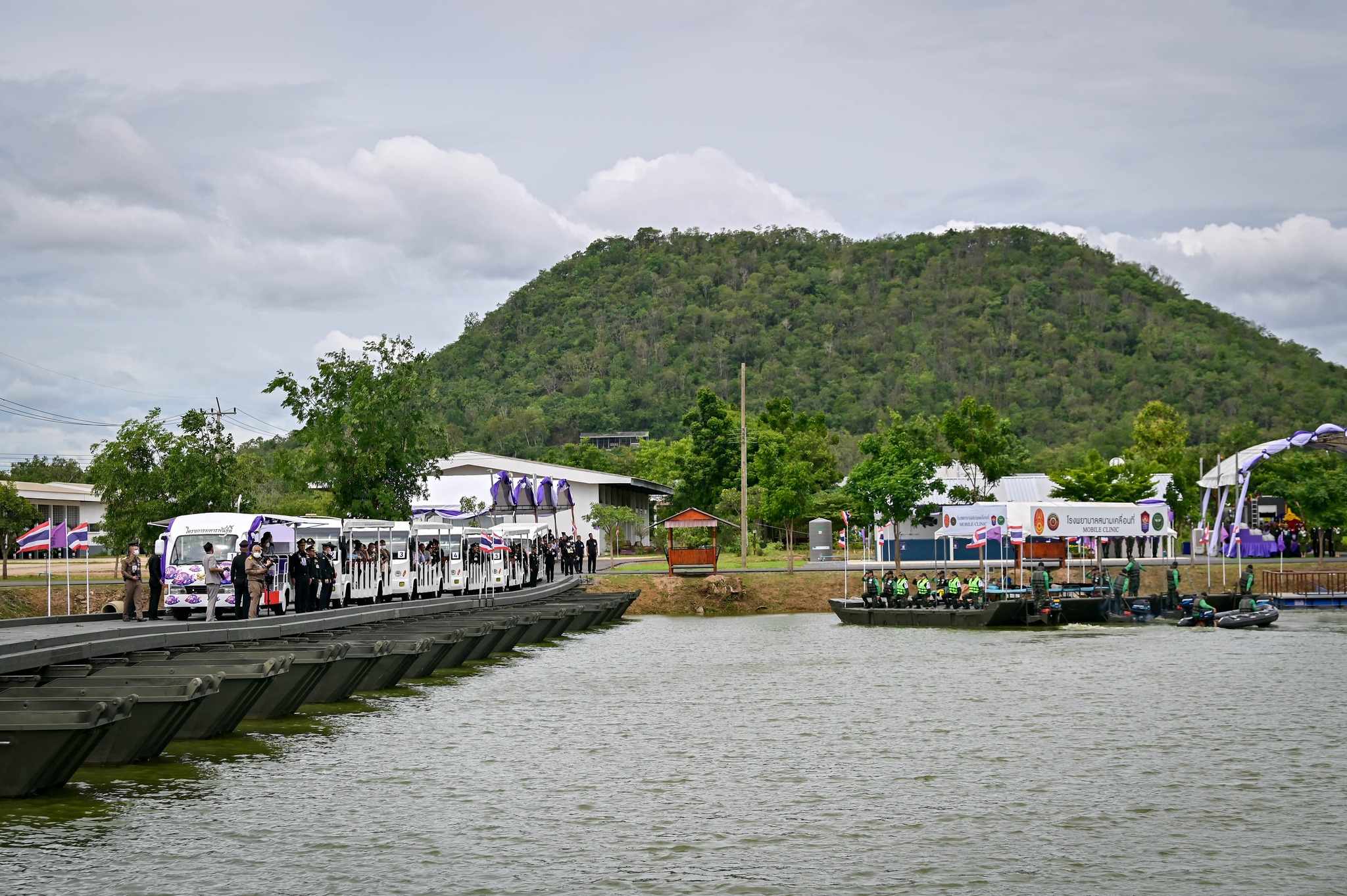 ระหว่างเส้นทางเสด็จฯ รถรางพระที่นั่งได้ข้ามสะพานเครื่องหนุนลอยแบบ M4 ซึ่งเป็นสะพานทอดข้ามที่ประกอบด้วยเรือทุ่นโลหะผสมที่มีความมั่นคงปลอดภัยสูง พร้อมทอดพระเนตรแพเครื่องหนุนลอยพับได้แบบ 79A (Ribbon Bridge) ซึ่งกองทัพบกได้ดัดแปลงให้เป็นโรงพยาบาลสนามเคลื่อนที่ (Mobile Clinic) เพื่อใช้ในภารกิจบรรเทาสาธารณภัยและช่วยเหลือประชาชนในพื้นที่ทุรกันดาร