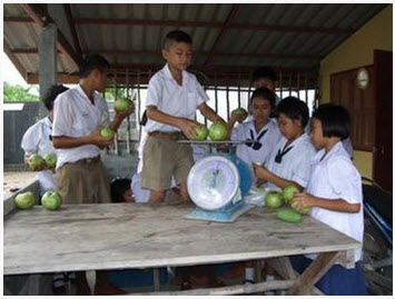 เด็กกำลังเดินดูแปลงปลูกฝรั่ง