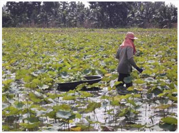คนงานกำลังเก็บดอกบัวเพื่อนำไปจำหน่าย
