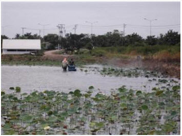 ทำการย่ำนาบัวไปเมื่อวันที่ 9 สิงหาคม 2555 และทำการหว่านสารเคมีกำจัดหอยเชอรี่เมื่อเช้าวันที่ 10 สิงหาคม 2555 ซึ่งหอยเชอรี่ในนาบัวมีปริมาณเยอะมาก