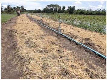ฃระหว่างแปลงนาข้าวและนาบัว ทำการยกร่องหว่านปุ๋ยคอก คลุมฟางหว่านผักบุ้งและคะน้าไว้
