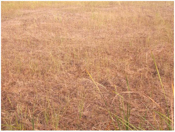 สภาพแปลงนาข้าวที่ล้มตายเสียหาย เก็บเกี่ยวไม่ได้
