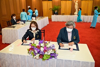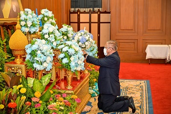 After that, the group including Mr. Thursak Boonyakachon, Mr. Techapol Thitayarasa, Deputy Secretary-General of the Chaipattana Foundation and staff of the Chaipattana Foundation traveled to Saha Thai Samakom Hall in the Grand Palace to attend in well-wishing ceremony and present the flower vase on the auspicious occasion of Her Majesty Queen Sirikit The Queen Mother's Birthday.