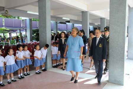 จากนั้น นางภากมล รัตตเสรี ผู้จัดการโรงเรียนฯ กราบบังคมทูลเบิกผู้มีจิตศรัทธาเข้าเฝ้าฯ ถวายเงิน และกราบบังคมทูลเบิกนักเรียนใหม่เข้าเฝ้าทูลละอองพระบาท ถวายตัวเป็นนักเรียน จำนวน 46 ราย ในการนี้นางอุดมศิลป์ ศรีสมบูรณ์ ผู้อำนวยการโรงเรียนฯ กราบบังคมทูลเบิกครูและนักเรียนที่มีความวิริยะอุตสาหะเข้าเฝ้าฯ รับพระราชทานรางวัลและทุนการศึกษา และนักเรียนชั้นประถมศึกษาปีที่ 6 จำนวน 16 คน กราบถวายบังคมลา จากนั้นเสด็จพระดำเนินทอดพระเนตรนิทรรศการผลงานและการแสดงของนักเรียนอนุบาลและประถมศึกษา เช่น การแสดงเทควันโด วิทยากล การแสดงผลงาน ศิลปะสร้างสรรค์ เป็นต้น
