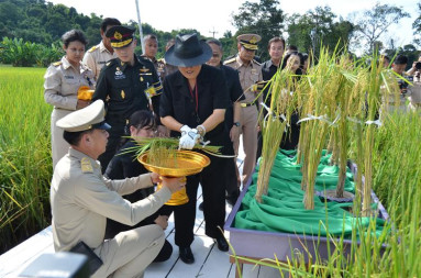วันพฤหัสบดีที่ 3 พฤศจิกายน 2559 เวลาประมาณ 13.30 น. สมเด็จพระเทพรัตนราชสุดาฯ สยามบรมราชกุมารี เสด็จพระราชดำเนินไปยัง โรงเรียนนายร้อยพระจุลจอมเกล้า จังหวัดนครนายก เพื่อทรงเกี่ยวข้าวในแปลงนาสาธิต โครงการทำนาในพื้นที่ว่างเปล่าอันเนื่องมาจากพระราชดำริศูนย์วิจัยข้าวปทุมธานี กรมการข้าว ได้จัดกิจกรรมการปลูกข้าวในฤดูนาปี 2559 2 กิจกรรม คือ กิจกรรมการปลูกข้าวพันธุ์ปทุมธานี 1 ได้ดำเนินการเพาะกล้าข้าวเมื่อวันที่ 5 กรกฎาคม 2559 บนถาดเพาะกล้าข้าว สำหรับปักดำด้วยเครื่องปักดำ เมื่อข้าวอายุได้ 20 วัน ได้นำกล้าข้าวที่ปักอยู่บนถาดไปปักดำด้วยรถ ปักดำแบบนั่งขับ ที่สามารถปักดำได้ครั้งละ 8 แถว อัตราการใช้กล้าข้าวจำนวน 45 ถาด/ต่อไร่ ภายหลังจากการปลูกได้ดูแลแปลงสาธิตการเกษตร โดยแบ่งออกเป็น 2 วิธีการ คือ การใช้วิธีเกษตรเคมี ในแปลงที่ 1 2 3 และ 4 รวมพื้นที่ 4.13 ไร่ การใช้วิธีเกษตรอินทรีย์ ในแปลงที่ 5 6 7 และ 8 รวมพื้นที่ 3.92 ไร่ ขณะนี้ข้าว ในแปลงนี้มีอายุ 121 วัน