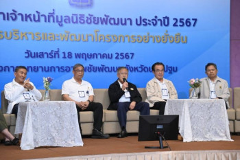 จังหวัดนครปฐม คณะผู้บริหารและเจ้าหน้าที่มูลนิธิชัยพัฒนา ทั้งส่วนกลางและส่วนภูมิภาคทั่วประเทศ ร่วมในงานสัมมนาเจ้าหน้าที่มูลนิธิชัยพัฒนา ปี 2567 ภายใต้หัวข้อ “การบริหารและพัฒนาโครงการอย่างยั่งยืน” โดยนายสุเมธ ตันติเวชกุล กรรมการและเลขาธิการมูลนิธิชัยพัฒนา ได้มอบนโยบายการทำงานแก่เจ้าหน้าที่ พร้อมทั้งบรรยายพิเศษเรื่อง “ทศพิธราชธรรม หลักการทรงงาน และปรัชญาเศรษฐกิจพอเพียง” เพื่อเป็นแนวทางในการปฏิบัติงานแก่เจ้าหน้าที่ จากนั้นได้เปิดโอกาสให้เจ้าหน้าที่ซักถามและแลกเปลี่ยนความคิดเห็นร่วมกับผู้บริหารในประเด็นต่างๆ ในช่วงบ่ายได้จัดให้มีการให้ความรู้ด้านการบริหารงาน เช่น การบริหารงบประมาณ การพัฒนาผลิตภัณฑ์ การบันทึกรายรับรายจ่าย เป็นต้น นอกจากนี้เจ้าหน้าที่ยังได้ร่วมกิจกรรมเวิร์กชอป ของโครงการอุทยานการอาชีพชัยพัฒนา โดยการฝึกอาชีพระยะสั้น เช่น การทำขนมลูกชุบและช่อม่วง