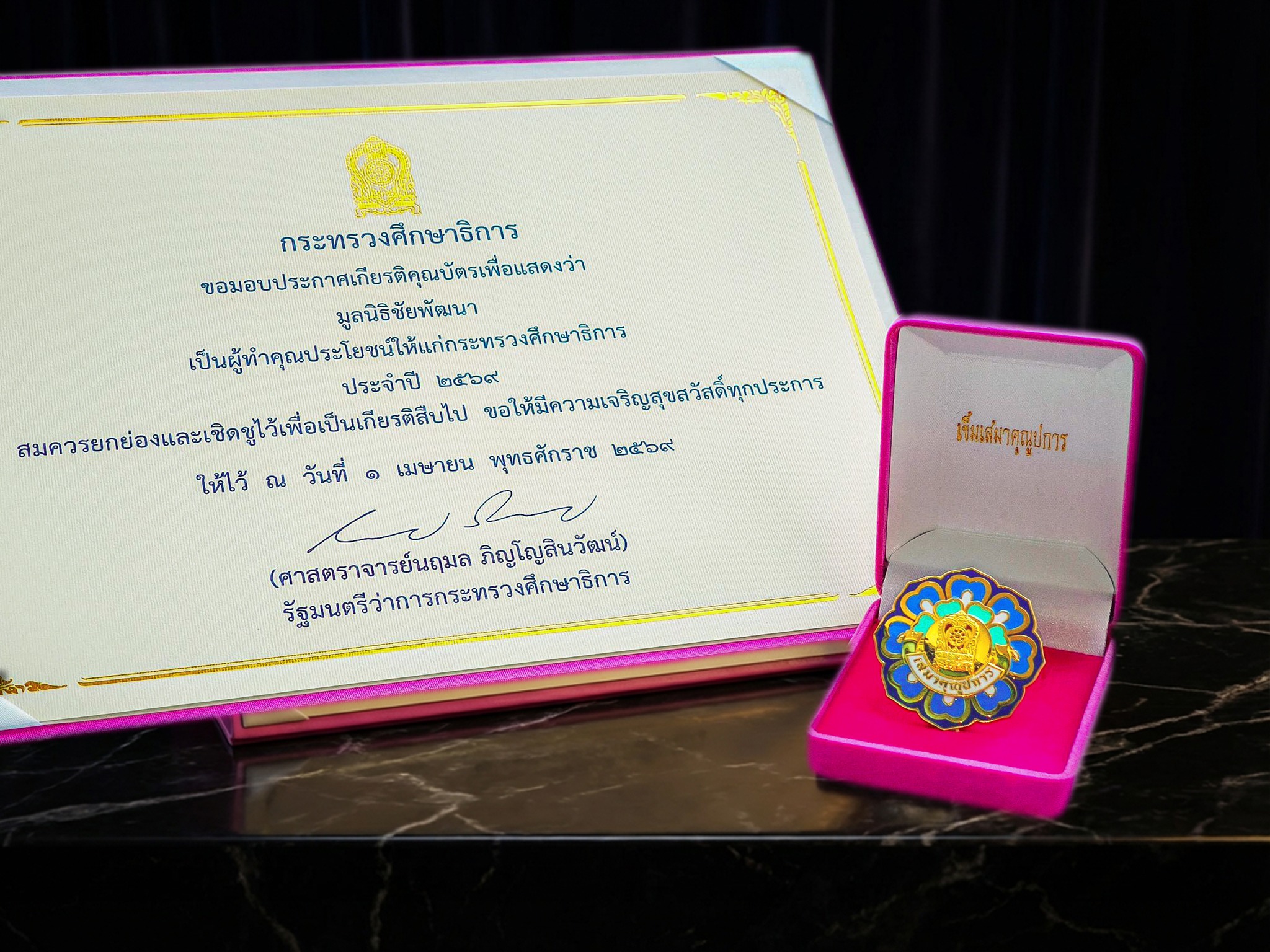 วันที่ 1 เมษายน 2569 สำนักงานปลัดกระทรวงศึกษาธิการ ได้มอบประกาศเกียรติคุณบัตรและเข็มที่ระลึก “เสมาคุณูปการ” แก่มูลนิธิชัยพัฒนา ในฐานะองค์กรผู้ทำคุณประโยชน์ให้แก่กระทรวงศึกษาธิการ ประจำปี 2569 โดยมี นายเตชพล ฐิยารักษ์ รองเลขาธิการมูลนิธิชัยพัฒนา เป็นผู้แทนรับมอบ ณ หอประชุมคุรุสภา กรุงเทพมหานคร