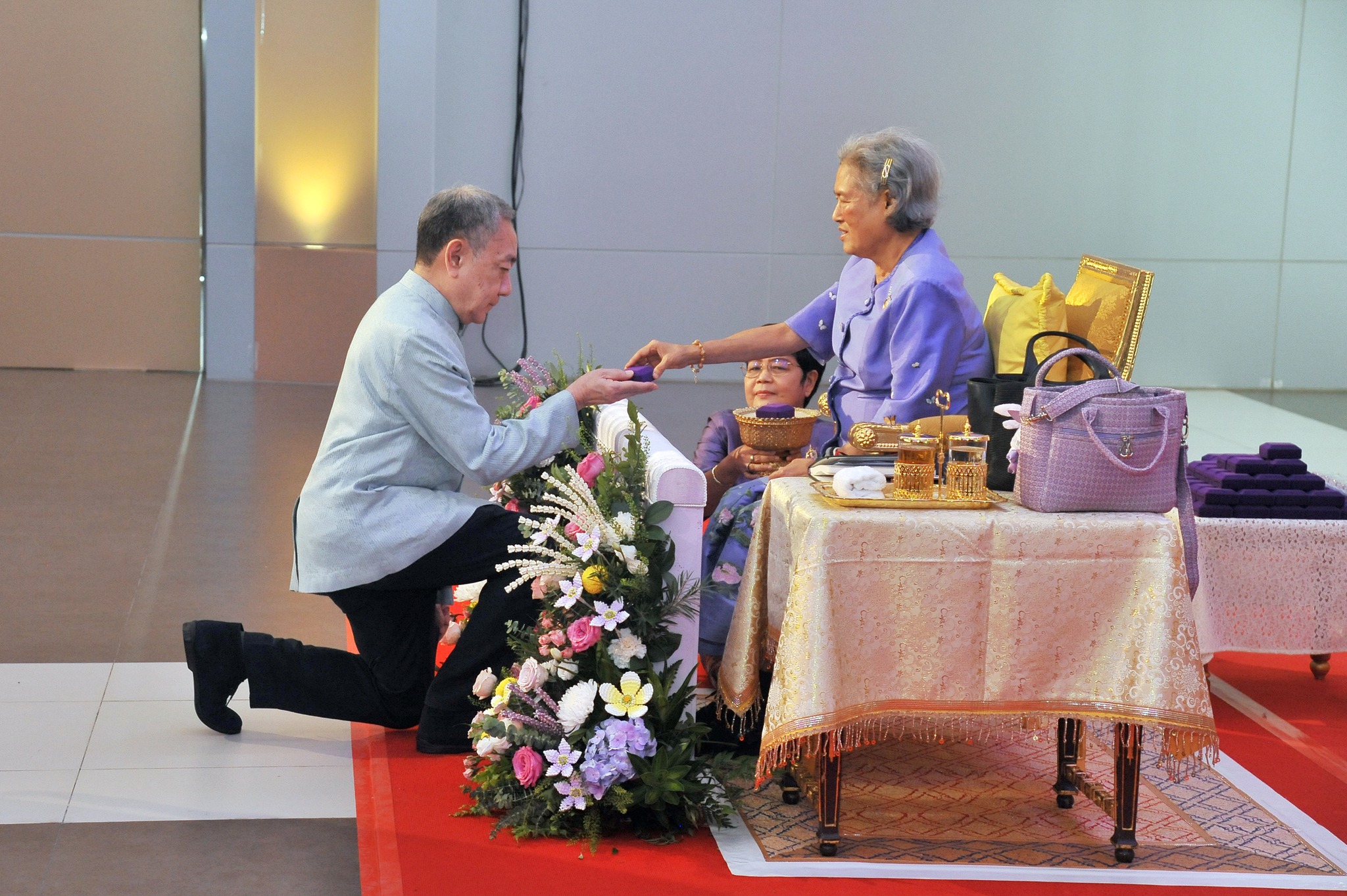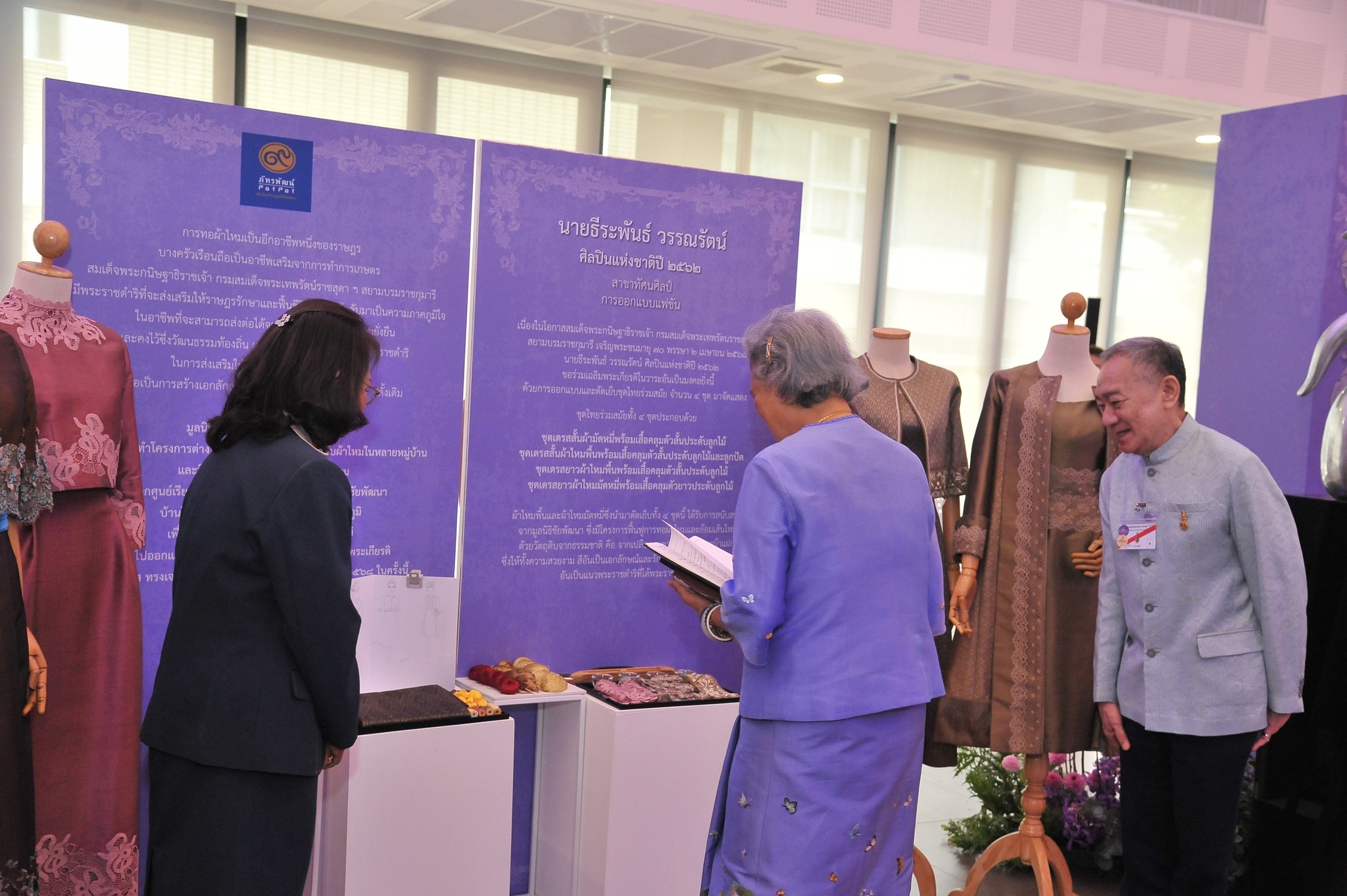 ในการนี้ ได้ทอดพระเนตรนิทรรศการเทิดพระเกียรติ สมเด็จพระกนิษฐาธิราชเจ้า กรมสมเด็จพระเทพรัตนราชสุดา ฯ สยามบรมราชกุมารี โดยส่วนหนึ่งของนิทรรศการจัดแสดงผลงาน “ชุดไทยร่วมสมัย” ออกแบบและตัดเย็บโดย นายธีระพันธ์ วรรณรัตน์ ศิลปินแห่งชาติ ซึ่งมูลนิธิชัยพัฒนาได้สนับสนุนผ้าไหมจากโครงการศูนย์เรียนรู้ด้านหม่อนไหมครบวงจรของมูลนิธิชัยพัฒนา บ้านโนนเสาเล้า อำเภอบ้านเขว้า จังหวัดชัยภูมิ ที่จัดตั้งขึ้นตามแนวพระราชดำริของสมเด็จพระกนิษฐาธิราชเจ้า กรมสมเด็จพระเทพรัตนราชสุดา ฯ สยามบรมราชกุมารี เพื่อส่งเสริมให้ราษฎรอนุรักษ์และฟื้นชีวิตผืนผ้าให้กลับมาเป็นความภาคภูมิใจในอาชีพการทอผ้าไหม รวมทั้งส่งเสริมการใช้สีธรรมชาติในการย้อมสีไหมเพื่อรักษาเอกลักษณ์ชุมชน