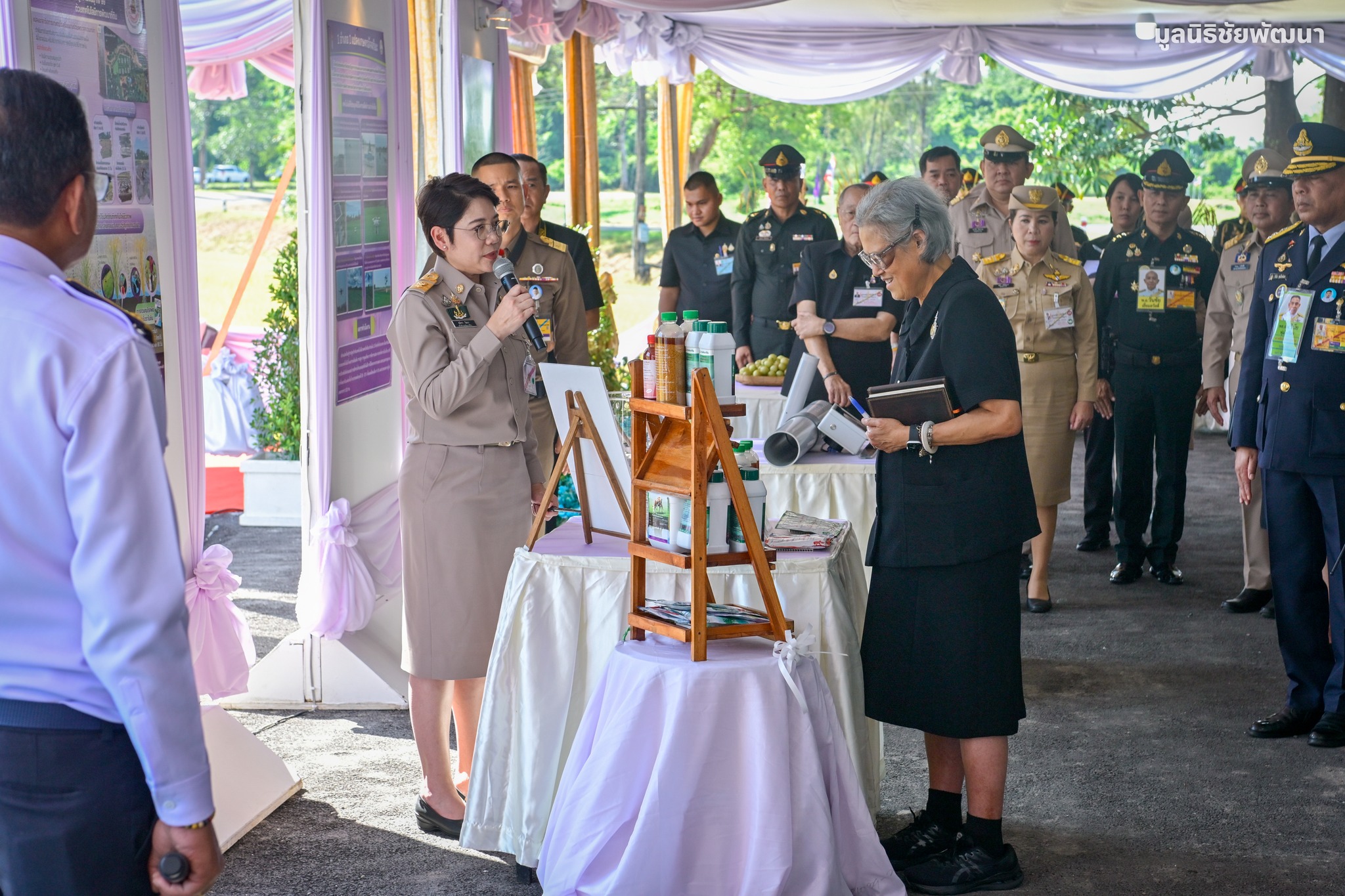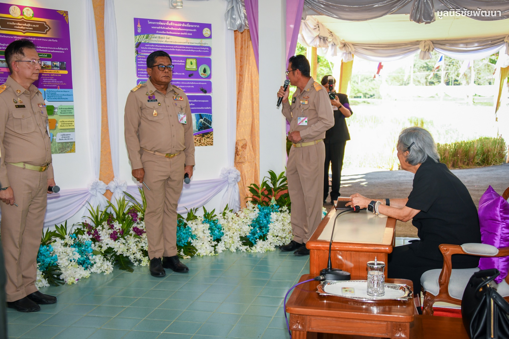 โอกาสนี้ ทรงรับฟังสรุปผลการดำเนินงานในรอบปีที่ผ่านมาจากหน่วยงานที่ร่วมดำเนินกิจกรรมในพื้นที่โรงเรียนนายร้อยพระจุลจอมเกล้า ประกอบด้วย ศูนย์วิจัยข้าวปทุมธานี สำนักงานเกษตรจังหวัดนครนายก กรมชลประทาน กรมวิชาการเกษตร กรมการข้าว กรมพัฒนาที่ดิน กรมประมง รวมถึงกองพันทหารราบและชมรมโครงการตามแนวพระราชดำริฯ โรงเรียนนายร้อยพระจุลจอมเกล้า