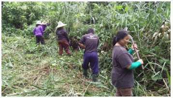 เจ้าหน้าที่ และพนักงานโครงการศึกษาทดลองปลูกปาล์มน้ำมัน และเกษตรผสมผสาน ช่วยกันถางป่า เพื่อปรับปรุงภูมิทัศน์บริเวณพื้นที่โครงการ ซึ่งเป็นเหมืองแร่ร้างค่ะ
