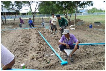 ทำการวางแนวท่อระบบสปริงเกอร์ที่จะใช้ในแปลงผัก