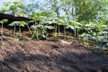 ฟักทองอยู่บนหลังคาบ้าน อีกไม่นานจะมาอยู่ที่ร้านจันกะผัก