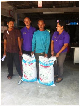 พนักงานโครงการช่วยยกอาหารปลาทะเลอัดเม็ด ให้ลูกค้าเกษตรกร ผู้ซึ่งเลี้ยงปลาในกระชัง พื้นที่ อ.ท้ายเหมือง จ.พังงา
