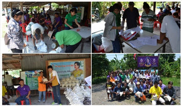 เจ้าหน้าที่โครงการแปลงสาธิตการทำนาในที่ดินของมูลนิธิชัยพัฒนา ได้แจกข้าวสารพันธุ์ปทุมธานี 1 และไรซ์เบอรี่ ซึ่งเป็นผลผลิตข้าว